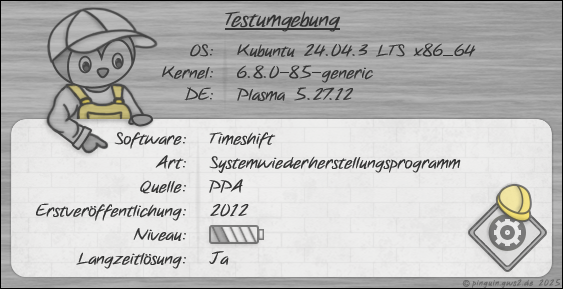 Das Bild zeigt eine charmant gestaltete Infotafel im Stil einer technischen Karteikarte – eine Mischung aus liebevollem Retro-Design und klarer Linux-Präzision. Im oberen Bereich prangt der Titel „Testumgebung“, der sofort erkennen lässt, dass es sich hier um eine dokumentierte Systemübersicht handelt. Rechts daneben steht ein freundlich gezeichneter Comic-Charakter in Arbeitsmontur – mit Kappe, Latzhose und einem kleinen Schraubenzieher in der Hand. Er wirkt wie das Maskottchen eines ehrlichen, bodenständigen Technikers, der zuverlässig über das System wacht. Darunter folgt eine geordnete Auflistung der technischen Basis: Das Betriebssystem ist Kubuntu 24.04.3 LTS x86_64, begleitet vom Kernel 6.8.0-85-generic und der Desktop-Umgebung Plasma 5.27.12 – eine moderne, stabile und zugleich visuell ansprechende Kombination. Im unteren Abschnitt befindet sich ein strukturierter Infoblock, der die getestete Software vorstellt: Timeshift – ein Systemwiederherstellungsprogramm, das über ein PPA (Personal Package Archive) bezogen wurde. Es wurde erstmals 2012 veröffentlicht und gilt als bewährte Lösung zur Sicherung und Wiederherstellung kompletter Linux-Systeme. Neben einem kleinen Batteriesymbol steht der Eintrag „Niveau“, was augenzwinkernd die Zuverlässigkeit und Reife der Software andeutet. Der Punkt „Langzeitlösung: Ja“ unterstreicht, dass Timeshift auch langfristig ein sicherer Begleiter bleibt. Rechts unten rundet ein weiteres Symbol das Design ab – ein Zahnrad mit einem gelben Bauhelm, das perfekt zum Thema „Systempflege und Sicherheit“ passt. Der graue Hintergrund mit feiner Textur und die handschriftlich anmutende Typografie verleihen dem Ganzen einen fast analogen Charme – wie eine Notiz aus einem Techniker-Tagebuch, digital zum Leben erweckt. Insgesamt wirkt das Bild wie eine liebevoll illustrierte Visitenkarte für Systemstabilität: technisch klar, grafisch warm und mit einem Schuss Nostalgie – eine Hommage an Linux-Handwerk und digitale Sorgfalt. GWS2.de - Oktober 2025