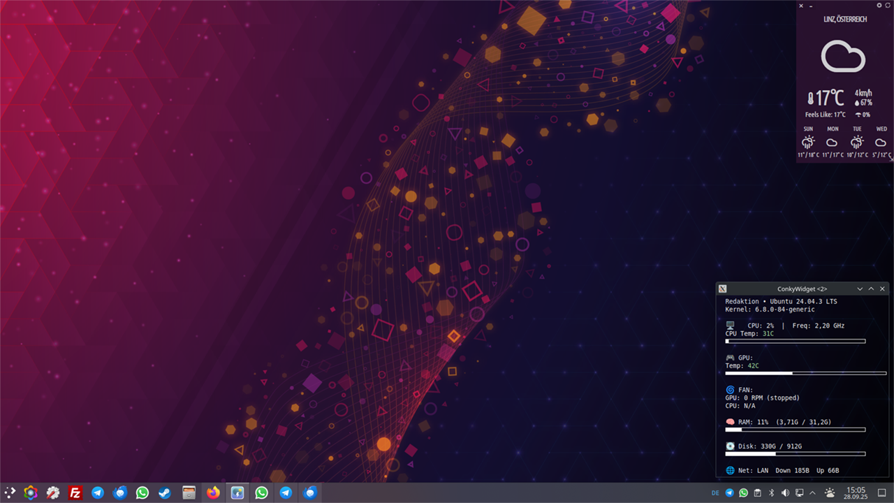 Auf dem Screenshot entfaltet sich eine ästhetisch durchkomponierte Desktop-Ansicht eines Kubuntu 24.04.3 LTS-Systems – elegant, technisch und zugleich wohnlich. Der Hintergrund ist ein tiefes Violett-Rot-Blau-Geflecht aus geometrischen Formen, Linien und Partikeln, das an digitale Sternenströme erinnert – eine perfekte Bühne für jemanden, der Funktionalität und Stil miteinander vereint. In der oberen rechten Ecke schwebt ein halbtransparentes Widget der Typhoon-Wetter-App, das mit klarer Typografie das aktuelle Wetter in Linz, Österreich zeigt: milde 17 °C, leichter Wind, und eine übersichtliche Drei-Tages-Prognose. Direkt darunter sitzt das Conky-Widget, das in nüchternem Schwarz-Weiß-Design die technischen Lebenszeichen des Systems preisgibt – CPU-Auslastung, Taktfrequenz, Temperatur, GPU-Status, RAM-Verbrauch und Netzwerkauslastung. Es wirkt wie das Cockpit eines präzise getunten Rechners: sachlich, verlässlich und zugleich beruhigend ordentlich. Am unteren Bildschirmrand zieht sich das Dock wie eine kleine Startbahn der Produktivität – hier finden sich Messenger-Programme wie Telegram, Signal und WhatsApp, flankiert von Firefox, Thunderbird für die E-Mail-Korrespondenz und FileZilla für den FTP-Transfer. Der Desktop vermittelt den Eindruck eines Systems, das tagtäglich im Einsatz ist – zwischen Kommunikation, Entwicklung und digitaler Kreativität. Doch gerade in dieser Symmetrie liegt eine gewisse Zerbrechlichkeit. Sollte das System eines Tages unerwartet abstürzen oder ein Update gründlich schieflaufen, wäre diese perfekt abgestimmte Arbeitsumgebung verloren – Widgets, Dock-Anordnung, Konfigurationen, all das feinjustierte Zusammenspiel aus Effizienz und Ästhetik. Deshalb ist es mehr als nur eine Empfehlung, regelmäßig mit Timeshift automatische Schnappschüsse zu erstellen. Diese Backups sind gleichsam digitale Lebensversicherungen: Sie frieren den jetzigen Zustand ein – das System, wie es hier in seiner ganzen Schönheit erstrahlt – und erlauben, ihn mit wenigen Klicks wiederherzustellen, sollte das Unvermeidliche eintreten. Kurzum: dieser Kubuntu-Desktop ist kein bloßer Arbeitsplatz, sondern ein sorgfältig gepflegtes Biotop aus Ordnung, Funktion und visuellem Wohlgefühl – und Timeshift sorgt dafür, dass er es auch bleibt. Desktop von GWS2.de - Oktober 2025
