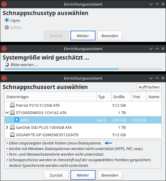 Der Splitscreen zeigt drei aufeinanderfolgende Stationen des Timeshift-Einrichtungsassistenten – wie ein kleiner Rundgang vom Start bis zur Zielfestlegung. Alles ist klar, sachlich und dennoch freundlich gestaltet, genau das richtige Werkzeug für jemanden, der seinen Linux-Desktop nicht dem Zufall überlassen will. Im ersten Bild begrüßt uns der Dialog „Schnappschusstyp auswählen“. Zwei Optionen stehen zur Wahl: rsync (aktiv auswählbar) und BTRFS (ausgegraut). Das verrät bereits etwas über das System: Die Root-Partition läuft offenbar nicht auf Btrfs, daher ist der Btrfs-Modus gesperrt. Kurz erklärt: Timeshift (rsync-Modus) arbeitet dateibasiert. Beim ersten Lauf kopiert es die ausgewählten Systemverzeichnisse vollständig; spätere Snapshots speichern dann nur noch geänderte Dateien und verknüpfen Unverändertes per Hardlinks. Ergebnis: mehrere Wiederherstellungspunkte ohne Platzverschwendung – schnell, robust und unabhängig vom Dateisystem, solange es „Linux-typisch“ ist. Timeshift (BTRFS-Modus) nutzt dagegen Btrfs-Subvolumes und Copy-on-Write – rasend schnelle Snapshots, aber eben nur möglich, wenn die Systempartition tatsächlich Btrfs verwendet. Unten warten die Knöpfe Zurück, Weiter und Beenden – der klassische Dreiklang der Gelassenheit. Das zweite Bild zeigt die Zwischenstation „Systemgröße wird geschätzt …“. Ein Fortschrittsbalken arbeitet sich voran, während Timeshift die relevanten Systemverzeichnisse analysiert (standardmäßig ohne das persönliche /home, außer man aktiviert dessen versteckte Konfigurationsdateien). Diese Schätzung ist wichtig, um zu prüfen, ob das Zielmedium genügend Luft hat – Snapshots sind zwar inkrementell, aber das erste Abbild kann einige Gigabyte groß werden, und Updates lassen die Summe mit der Zeit anwachsen. Dieser Schritt ist also die nüchterne Platz-Realitätsprüfung, bevor man Speicher mit gutem Gefühl reserviert. Im dritten Bild folgt der praktische Teil: „Schnappschussort auswählen“. Eine Tabelle listet verfügbare Datenträger, Typ, Größe und freien Platz auf. Markiert ist sdb2, ein ext4-Volume mit 438 GB und satten 416 GB frei – ein ideales Ziel. Darunter erinnert eine Hinweisbox an die Regeln: Nur Linux-Dateisysteme werden unterstützt; NTFS, FAT & Co. sind tabu, ebenso Fern- und Netzwerkspeicherorte (sie wären zu fehleranfällig und teils nicht transaktionssicher). Timeshift legt seine Sicherungen im Wurzelverzeichnis des gewählten Datenträgers in einem eigenen Ordner ab – sauber getrennt vom System. Warum eine HDD/SSD statt eines USB-Sticks als Backup-Medium? Zuverlässigkeit & Lebensdauer: Sticks haben begrenzte Schreibzyklen und leiden unter billigen Controllern; eine interne/extern angedockte HDD/SSD (SATA oder USB-Gehäuse) steckt kontinuierliche Inkrement-Backups deutlich besser weg. Leistung: Snapshot-Läufe bestehen aus vielen kleinen Lese-/Schreiboperationen. HDD/SSD sind bei Random-IO und großen Datenblöcken spürbar flotter und stabiler als die meisten Sticks. Kapazität: Mit mehreren Wiederherstellungspunkten wächst der Bedarf. 500 GB–1 TB als Reserve sind schnell erreicht – Sticks sind hier entweder knapp oder unverhältnismäßig teuer. Integrität: Externe Laufwerke bieten SMART-Werte (bei HDD/SSD), verlässliche Dateisysteme (ext4, xfs, btrfs) und geringeres Risiko plötzlicher „Abwürfe“ bei wackeligen Ports. Best-Practice zum Mitnehmen: Zielpartition als ext4 bereitstellen (wie hier sdb2), genügend freien Platz einplanen, anschließend einen Zeitplan definieren (z. B. 5 tägliche, 3 wöchentliche, 2 monatliche Snapshots), und ab und zu eine Probe-Wiederherstellung testen. So wird aus drei nüchternen Dialogen ein belastbares Sicherheitsnetz – und der liebevoll konfigurierte Kubuntu-Desktop bleibt im Ernstfall mit wenigen Klicks bewahrt. Deutschsprachiges Ubuntu Handbuch - Pinguin GWS2.de