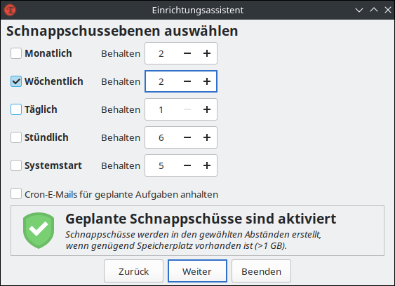 Der Screenshot zeigt die Konfigurationsseite „Schnappschussebenen auswählen“ im Timeshift-Einrichtungsassistenten. Oben links sind die verfügbaren Intervallarten als Liste aufgeführt: Monatlich, Wöchentlich, Täglich, Stündlich und Systemstart. Rechts daneben steht jeweils „Behalten“ mit einem kleinen Zählerfeld samt Minus- und Plus-Schaltflächen, über das die Aufbewahrungsanzahl festgelegt wird – also wie viele Snapshots der betreffenden Ebene rotierend vorgehalten werden, bevor der älteste automatisch gelöscht wird. Im gezeigten Zustand ist „Wöchentlich“ aktiv und mit einem Häkchen markiert; der Retentionszähler steht auf 2. Die übrigen Ebenen sind sichtbar, aber nicht aktiviert. Ihre voreingestellten Werte lauten Monatlich: 2, Täglich: 1, Stündlich: 6 und Systemstart: 5. Diese Zahlen definieren eine klassische Pyramide aus wenigen Langzeit- und mehreren Kurzzeit-Sicherungen, die Speicherverbrauch und Wiederherstellungstiefe in ein praktikables Gleichgewicht bringen. Unter der Liste befindet sich eine zusätzliche, derzeit deaktivierte Option: „Cron-E-Mails für geplante Aufgaben anhalten“ – eine Komforteinstellung, die bei aktivierter Systemmail-Benachrichtigung stille Backups ermöglicht, ohne Statusmails zu versenden. Im unteren Drittel des Fensters blendet Timeshift eine grün hinterlegte Statusbox ein: „Geplante Schnappschüsse sind aktiviert“. Der erklärende Satz darunter hält fest, dass die Snapshots in den gewählten Abständen erstellt werden, sofern genügend Speicherplatz vorhanden ist (> 1 GB). Diese Meldung fungiert als Gesundheitsanzeige der Planung: Zeitpläne sind wirksam, der Dienst ist aktiv, die Mindestbedingungen sind erfüllt. Die Navigationsleiste am Fuß des Dialogs bietet die drei bekannten Schaltflächen „Zurück“, „Weiter“ und „Beenden“. „Weiter“ ist hervorgehoben und signalisiert die Bereitschaft, mit den gewählten Parametern fortzufahren. Die Titelleiste trägt schlicht „Einrichtungsassistent“, dazu die Fensterkontrollen rechts. Inhaltlich bündelt dieser Dialog die Retention-Strategie des Systemsicherungsplans: Jede Ebene steht für einen Auslösemechanismus (Zeitintervall oder Ereignis „Systemstart“), der Zähler bestimmt die Tiefe der Historie. Aktiviert bleibt hier lediglich die wöchentliche Sicherung mit zwei Generationen – eine besonders speicherschonende Grundeinstellung, die sich gut für stabile Arbeitsplätze eignet. Werden weitere Ebenen zugeschaltet (etwa „Täglich“ oder „Systemstart“), wächst die Wiederherstellungsauswahl für jüngere Zeitpunkte, gleichzeitig steigt der Platzbedarf. Genau dieses Spannungsverhältnis macht die Seite zu einem zentralen Stellbrett: Wie viel Wiederherstellungsfreiheit wird gewünscht und wie viel Speicher darf es kosten? GWS2.de - Oktober 2025