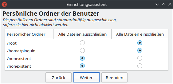 Zu gu­ter Letzt geht es im Ein­rich­tungs­as­sis­ten­ten dar­um, den Um­fang der Da­ten­si­che­rung fest­zu­le­gen. Für ein voll­stän­di­ges Sys­tem­ab­bild soll­ten al­le Da­tei­en von /root und /home im Back­up ein­be­zo­gen wer­den.