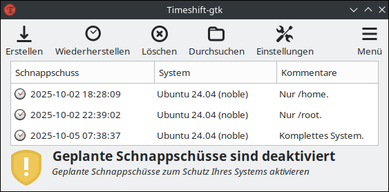 Der Screenshot zeigt die Hauptansicht von Timeshift-gtk nach einer erfolgreichen Ersteinrichtung. Oben liegt die Symbolleiste mit den zentralen Aktionen – Erstellen, Wiederherstellen, Löschen, Durchsuchen, Einstellungen sowie Menü – jeweils mit klaren, monochromen Icons. Darunter listet eine Tabelle die vorhandenen Sicherungspunkte. In der Spalte „Schnappschuss“ stehen drei Zeitstempel: 2025-10-02 18:28:09, 2025-10-02 22:39:02 und 2025-10-05 07:38:37. Die Spalte „System“ weist alle drei Snapshots der gleichen Installation zu (Ubuntu 24.04 (noble)), während die Spalte „Kommentare“ präzisiert, was jeweils gesichert wurde: beim ersten Eintrag „Nur /home.“, beim zweiten „Nur /root.“, beim dritten „Komplettes System.“. Diese Kommentare spiegeln die zuvor getroffenen Einschluss-/Ausschlussentscheidungen im Einrichtungsassistenten wider: Zunächst entstanden offenbar zwei gezielte Testsicherungen – einmal ausschließlich das Benutzerverzeichnis, einmal ausschließlich das Root-Home –, anschließend folgte am 05.10. ein vollständiger System-Snapshot, der Betriebssystem, Konfigurationen und (je nach Auswahl) auch Benutzerdateien umfasst. Links neben jedem Eintrag sitzt ein runder Statusindikator mit Häkchen, der bestätigt, dass die jeweiligen Schnappschussverzeichnisse vorhanden und konsistent registriert sind. Im unteren Bereich prangt ein gelb hinterlegter Hinweis mit Schild-Symbol: „Geplante Schnappschüsse sind deaktiviert“, ergänzt um die Empfehlung, die Planung zum Schutz des Systems zu aktivieren. Das erklärt den aktuellen Zustand: Die vorhandenen Sicherungen wurden manuell angestoßen; ein automatischer Rhythmus (stündlich/täglich/wöchentlich/Systemstart) ist noch nicht aktiv. In der Praxis bedeutet das: Solange die Planung deaktiviert bleibt, entstehen keine neuen Wiederherstellungspunkte, und der Schutzgrad hängt allein von manuellen Läufen ab. Abhilfe schafft ein Besuch in Einstellungen → Zeitplan, wo sich die gewünschten Ebenen samt Aufbewahrungsanzahl definieren lassen. Damit wächst die Historie der Einträge in genau dieser Liste, und die Schaltflächen „Wiederherstellen“ und „Durchsuchen“ können jederzeit auf jüngere Systemzustände zugreifen – entweder zur kompletten Rücksetzung oder zum gezielten Herausholen einzelner Dateien aus einem Snapshot. Backups im deutschsprachigen Ubuntu-Handbuch 2025